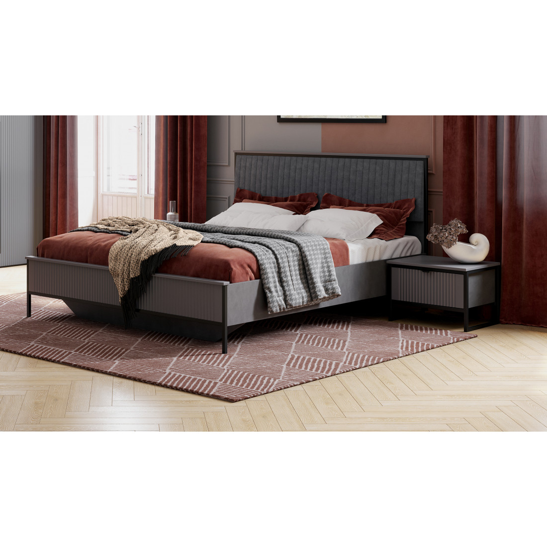 Коллекцию модульной спальни "Нора" отличает современный оригинальный стиль. Декоративная продольная фрезеровка на МДФ фасадах цвета "Графит" и опоры на металлокаркасе цвета "Черная эмаль" соответствуют модным тенденциям этого года в ведущих зарубежных коллекциях.