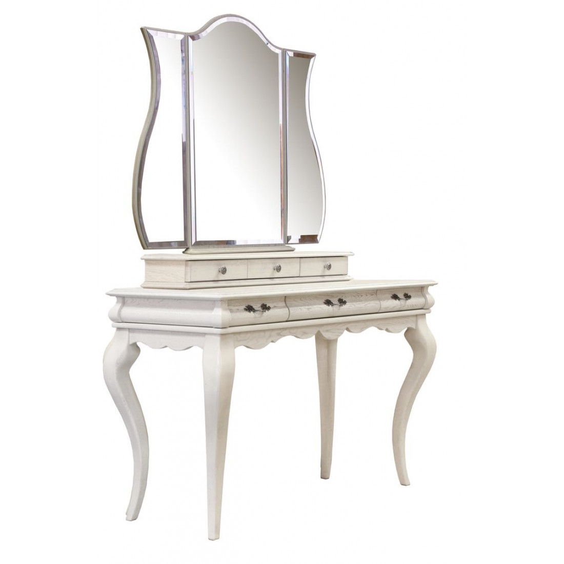 Туалетный столик с тройным зеркалом продолжает модельный ряд коллекции мебели для спальни "Оскар". Столик декорирован гнутыми ножками и резьбой. Выдвижные ящики на направляющих. Фасад сделан из массива дуба, окрашен в оттенок "Белая эмаль с патиной".